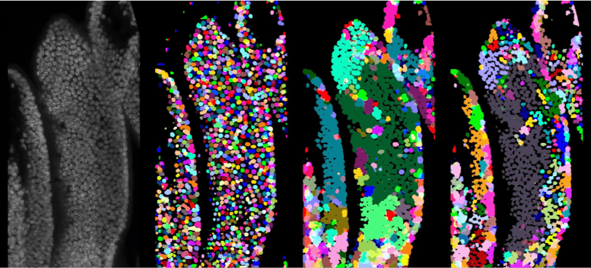 (Left to right) Original, Segmentations by Deepsynth, CellProfiler and CellProfiler with optimization