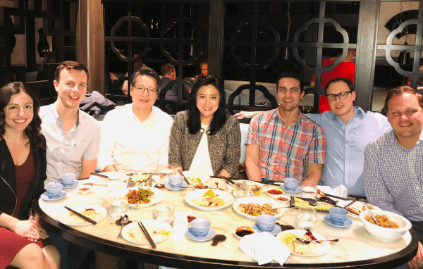 a collage of three photos showing a radiologist reviewing scans, a patient in an MRI machine, and a group of physicians at a social event